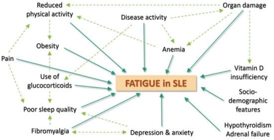 Fibromyalgia is a major predictor of fatigue in SLE [14,18,36]. In a study conducted by Touma et al., trajectories with higher fatigue scores were associated with a higher prevalence of fibromyalgia [20]. Fibromyalgia is common in SLE patients (from 6.2% to 30% of patients) but may be underdiagnosed by physicians [21,37]. Consequently, the role of fibromyalgia should be considered in SLE patients who complain about fatigue and widespread pain. Other frequent comorbidities such as anemia, hypothyroidism, or adrenal failure are risk factors in fatigue. Vitamin D insufficiency was associated with fatigue in SLE in some but not all studies [38,39]. SLE patients have a high risk of vitamin D deficiency because of photoprotection as well as in case of renal failure.