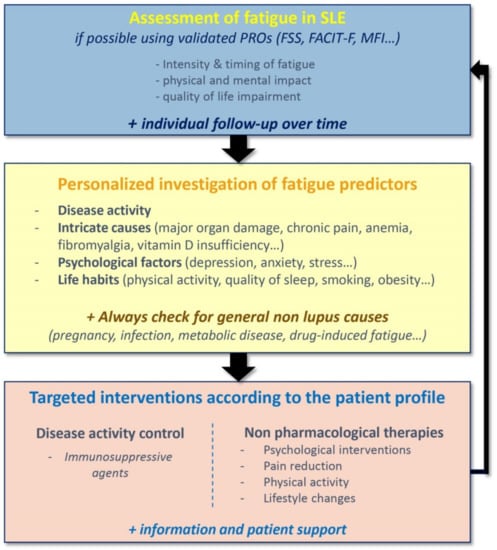 At this time, there is no validated recommendation for the management of fatigue in SLE. Since fatigue may be influenced by a variety of factors and because of the diverse profiles of fatigue in SLE, the management of fatigue should rely upon an individualized person-centered approach (Figure 2). Women with SLE have reported the need for fatigue acknowledgement by clinicians, as well as conversations about fatigue, with information about coping strategies [59]. Fatigue management in SLE would start with an assessment of the intensity and the characteristics of fatigue using validated scales, enabling an individual follow-up of fatigue over time. In recent years, there has been an increasing interest in using Patient Reported Outcomes (PROs), because they place the patients at the center of their health management and help to establish a trusting physician-patient relationship. The most commonly PROs used to evaluate fatigue in SLE are the Fatigue Severity Scale (FSS), the FACIT-fatigue score, which we use in clinical practice, the Fatigue-VAS, which are unidimensional scales measuring fatigue intensity, and the Multi-dimensional Fatigue Inventory (MFI), which analyze general fatigue, physical and mental components of fatigue as well as the reduction in activities and motivation [60]. A personalized investigation of fatigue predictors is needed, with evaluation of disease activity, search for intricate causes (major organ damage, chronic pain, anemia…) and psychosocial factors, assessment of life habits (physical activity, quality of sleep, smoking, obesity…). Common medical causes of fatigue, such as pregnancy, infections, metabolic diseases or drug-induced fatigue must not be forgotten. Finally, optimal management of fatigue for patients with SLE should be based on providing targeted interventions, according to the patient profile [61].
