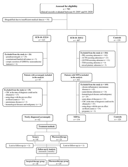 The research was designed as a retrospective, cross-sectional, and observational, single-center study. Patients’ data were obtained from paper-based and/or electronic charts. The medical records of 785 patients identified with codes E22.0 and D35.2 according to the International Classification of Diseases revision 10 (ICD-10), hospitalized in the Department of Endocrinology, Diabetology and Metabolic Diseases at the Medical University of Lublin, Poland, during the period between 1 January 2005 and 31 January 2020 were reviewed. The diagnosis of acromegaly was based on the presence of characteristic clinical features, increased secretion of IGF-1 adjusted for age and sex, and inability to suppress the GH level < 1 ng/mL in an oral glucose tolerance test (OGTT) after administration of 75 g of glucose according to the Endocrine Society Clinical Practice Guideline [38]. In patients with contraindications to performing OGTT, e.g., previously diagnosed diabetes mellitus, the GH concentration was tested several times (every 30 min for 2–3 h) and the average level < 2.5 ng/mL was allowed to exclude acromegaly [3,39]. Following the biochemical diagnosis of acromegaly, magnetic resonance imaging (MRI) with contrast enhancement of the sella turcica region was performed to visualize tumor size and appearance, as well as parasellar extent [38,40]. The NFPA was defined as a hypointense or isointense tumor on T1-weighted images on the MRI and the absence of clinical and biochemical evidence of hormonal hypersecretion [41]. The control group consisted of 120 randomly selected, healthy individuals without disturbances of the hypothalamic-pituitary system and other diseases affecting CBC-derived parameters. The exclusion criteria for the study and control groups were as follows: acute and chronic infection, autoimmune/inflammatory systemic diseases, intracranial surgery or trauma history within the central nervous system during the past 12 months, acute phase of diseases including pituitary apoplexy, other cerebrovascular events, myocardial infarction, severe hepatic or renal dysfunction, using systemic drugs with the proven effect on blood counts, adrenocorticotropic axis insufficiency during replacement therapy (at diagnosis or after surgery), pregnancy, past or present malignancy history and hematological disorders, constitutional/familial tall stature and pseudoacromegaly, ectopic secretion of growth hormone-releasing hormone (GHRH) or GH by a neuroendocrine tumor, other hormone-secreting pituitary adenomas. Moreover, patients with incomplete medical documentation or those who did not have a CBC test at the time of diagnosis were also excluded from the study. After evaluation for eligibility, 62 patients with acromegaly (Group 1), 134 with NFPAs (Group 2), and 120 healthy individuals (Group 3) were enrolled in the analysis. The inclusion and exclusion criteria, as well as the inclusion chart, are presented in Figure 1.