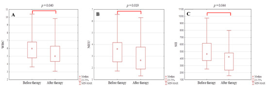 Non-parametric tests were used for the statistical analysis due to the non-normal distribution of the most examined variables and the small sample size of the study group. Data are presented as medians with interquartile ranges (IQRs) for continuous variables independently of the Gaussian distribution. Categorical ones are expressed as numbers with percentages (%). The Chi-Square test was performed to determine sex distribution between groups. The Wilcoxon rank-sum test was used to compare paired continuous variables. The comparison of the values of CBC-derived indicators dependent on selected variables was carried out using non-parametric tests: the Kruskal-Wallis one-way analysis of variance by ranks (for more than two groups) or the U-Mann-Whitney (for two groups). The Spearman’s correlation analysis was used to calculate the correlation coefficients. The area under the curve (AUC) value using receiver operating characteristic (ROC) analysis was performed to evaluate the optimal cut-off value for selected parameters. Two-way ANOVA-type nonparametric analysis for Longitudinal Data (nparLD) was carried out to analyze the interaction of time-points and treatment groups as simultaneous influence factors on variables. All p-values are two-tailed, and p-values < 0.05 were considered as statistically significant. The statistical analysis was performed with STATISTICA 13.3.0. software for Windows (TIBCO Software Inc., Palo Alto, CA, USA) and R Studio version 3.6.1 (R Studio, Boston, MA, USA).