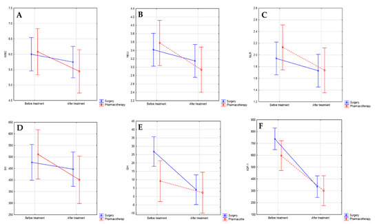 (A–F) Analysis using nparLD resulting from the effect of different factors (methods of treatment: pharmacotherapy, surgery; time: before and after therapy) on blood count parameters. (A) The interaction effect of the time (p = 0.022). WBC before: surgery 5.67 (IQR 4.80–7.15), pharmacotherapy 5.98 (IQR 4.79–6.84); WBC after: surgery 5.56 (IQR 4.73–6.64), pharmacotherapy 5.00 (IQR 4.33–6.30). (B) The interaction effect of the time (p = 0.007). NEU before: surgery 3.16 (IQR 2.44–4.05), pharmacotherapy 3.63 (IQR 2.53–4.17); NEU after: surgery 2.89 (IQR 2.41–3.73), pharmacotherapy 2.66 (IQR 1.91–3.78). (C) The interaction effect of the time (p = 0.008). NLR before: surgery 1.75 (IQR 1.36–2.32), pharmacotherapy 1.98 (IQR 1.30–2.85); NLR after: surgery 1.57 (IQR 1.22–2.14), pharmacotherapy 1.56 (IQR 1.06–2.21). (D) The interaction effect of the time (p = 0.012). SII before: surgery 417.46 (IQR 313.21–599.79), pharmacotherapy 464.40 (IQR 372.40–616.70); SII after: surgery 380.76 (IQR 268.08–561.65), pharmacotherapy 422.84 (IQR 235.84–477.74). (E) The interaction effect of the group and the time (p = 0.004). GH before: surgery 11.65 (IQR 3.80–25.10), pharmacotherapy 4.61 (IQR 2.31–9.41); GH after: surgery 0.87 (IQR 0.50–3.59), pharmacotherapy 1.56 (IQR 0.64–2.78). (F) The interaction effect of the group and the time (p = 0.012). IGF-1 before: surgery 675.00 (IQR 565.00–900.00), pharmacotherapy 534.50 (IQR 380.95–759.50); IGF-1 after: surgery 242.35 (IQR 177.00–357.60), pharmacotherapy 277.60 (IQR 198.85–393.70). p-value < 0.05 was statistically significant. WBC—white blood cell; NEU—neutrophil; NLR—neutrophil-to-lymphocyte ratio; SII—systemic immune-inflammation index; GH—growth hormone; IGF-1—insulin-like growth factor 1.