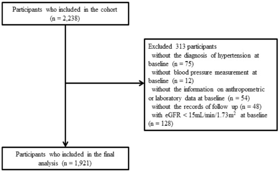 The KNOW-CKD enrolled 2238 patients with CKD between 2011 and 2016 from nine major university-affiliated tertiary care hospitals throughout South Korea. The participants were followed up until 2020. This study had an ethnically homogenous population group consisting of Koreans aged 20 to 75 years with CKD stages 1 to 5 who were not on dialysis and had not undergone kidney transplantation. A total of 75 participants who did not have information of hypertension were excluded. A further 114 participants were excluded because of inadequate information about their BP or anthropometric or laboratory data at baseline, or lack of follow-up records. A total of 128 participants with an estimated glomerular filtration rate (eGFR) less than 15 mL/min/1.73 m2 were also excluded because they were CKD stage 5 [18]. Finally, 1921 participants were included in this study (Figure 1).
