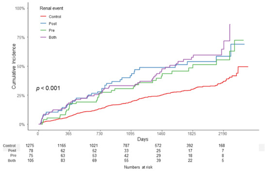 Kaplan–Meier survival curves showed statistically significant differences in the incidence of the end-point renal outcome between the ATRH subgroups (p < 0.001) (Figure 2). End-point renal outcome occurred more frequently in the ATRH group than in the control group, and among them, the most frequent occurrences were in the BOTH group than in the PRE group and POST group.