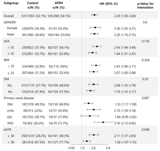 We further evaluated the association between ATRH and the end-point renal outcome in several subgroups (Figure 3). There were no significant differences in the outcome according to sex, age, BMI, presence of DM, and the existence of primary renal disease. However, there was significant heterogeneity in the HR for the end-point renal outcome associated with ATRH in the subgroups with eGFR ≥ 30 mL/min/1.73 m2 and eGFR < 30 mL/min/1.73 m2. eGFR ≥ 30 mL/min/1.73 m2 was associated with a significantly higher OR (HR, 2.11; 95% CI, 1.57 to 2.83) than eGFR < 30 mL/min/1.73 m2 (HR, 1.56; 95% CI, 1.07 to 1.72) (p = 0.048).