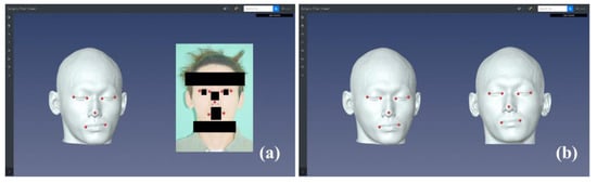 Previously, we developed an NHP reproduction method based on a pose from orthography and scaling with iterations (POSIT) algorithm using a single facial photograph [22]. In the study, the camera and CT coordinate systems coincided using the global coordinate system, as the CT scanner was typically positioned in the global coordinate system. The method determined the 3D rotation matrix using the feature points designated in the 2D photograph image and the corresponding 3D CT model based on the POSIT algorithm [22]. The landmarks used for NHP reproduction were the pronasale, bilateral exocanthion, endocanthion, and cheilion (Figure 1). The 3D rotational matrix was applied to the CT skeletal model to reproduce the CT model with NHP, then the NHP CT skeletal model was uploaded to a cloud-based storage platform as an STL file for sharing. The virtual osteotomy was performed with Geomagic Freeform software (Geomagic Inc., Morrisville, NC, USA) after importing the NHP CT model from storage. The virtual maxillary and mandibular distal and proximal segment models were generated by cutting the NHP CT model according to the planes used in actual surgery. After finishing the virtual osteotomy, the digital skeletal models were uploaded to the cloud-based storage platform as STL files for sharing.