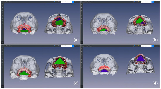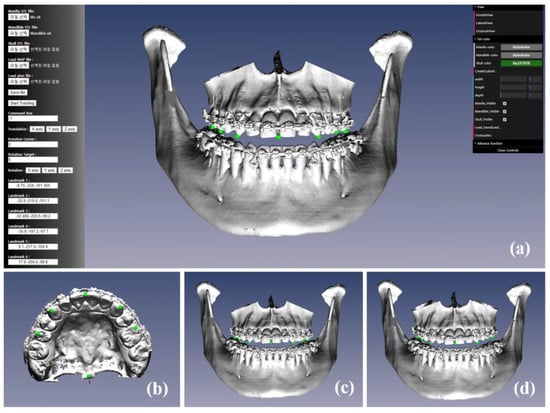 Previously, we developed methods for planning and simulation for orthognathic surgery using digital skeletal models with NHP in a local application [15,22]. In the present study, the skeletal models were downloaded from cloud-based data storage as STL files and were imported into the cloud-based application for planning and simulation on the web browser (Figure 2). The landmarks used for the displacement were designated on the skeletal model with high-resolution and artifact-free dentitions, then the desired amount of displacement was entered using a graphic user interface (Figure 2a,b). The bone segment was translated linearly along the left–right (x-axis), advance–setback (y-axis), and impaction–elongation (z-axis) directions using a given amount of displacement, then rotated around the rotation center by the angle of rotation in degrees determined between the target and goal points based on the method that we had developed previously [15,30]. After finishing the planning using the skeletal model, the total planned translational and rotational displacements were applied to the preoperative maxillomandibular complex (MMC) model and landmarks (Figure 2c), which simulated their final positions (Figure 2d). Both the simulation model and displaced landmarks were verified interactively by zooming, rotating, and translating the digital model.