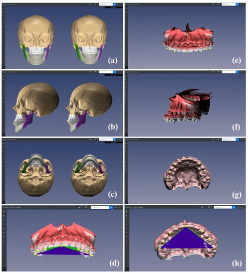 Frontal, lateral, bottom, and custom camera views used for reviewing simulation models and landmarks: comparisons between the preoperative and simulation maxillomandibular complex (MMC) models (a–c), between the preoperative (model in gray and landmarks in yellow) and simulation (model in red and landmarks in cyan) maxillary models and landmarks (e–g), and between the preoperative (in blue) and simulation (in green) occlusal plane inclinations (d,h) in different views.