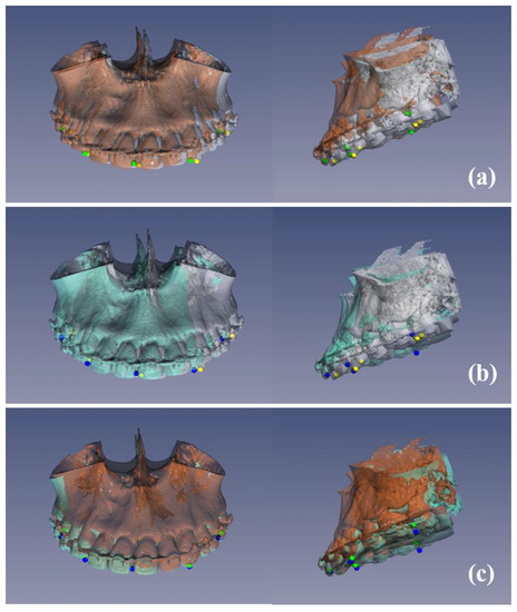 - Almukhtar, A.; Ju, X.Y.; Khambay, B.; McDonald, J.; Ayoub, A. Comparison of the Accuracy of Voxel Based Registration and Surface Based Registration for 3D Assessment of Surgical Change following Orthognathic Surgery. PLoS ONE 2014, 9, e93402. [Google Scholar] [CrossRef]
