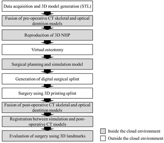 Overall procedure used for orthognathic surgery using a 3D printing splint with fully digitalized planning, simulation, and evaluation. When the process was performed outside the cloud environment, the STL data, which had no personally identifiable information, were transferred from NAS storage to the local workstation.