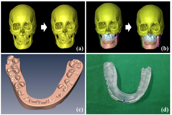 - Uribe, F.; Janakiraman, N.; Shafer, D.; Nanda, R. Three-dimensional cone-beam computed tomography-based virtual treatment planning and fabrication of a surgical splint for asymmetric patients: Surgery first approach. Am. J. Orthod. Dentofac. Orthop. 2013, 144, 748–758. [Google Scholar] [CrossRef]