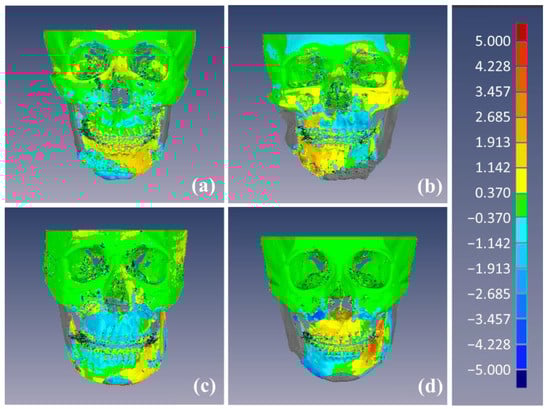 After surgery, the postoperative CT models were matched to the simulation models via the registration process. Figure 7 shows the color mapping of the discrepancies between the simulation and postoperative CT models.