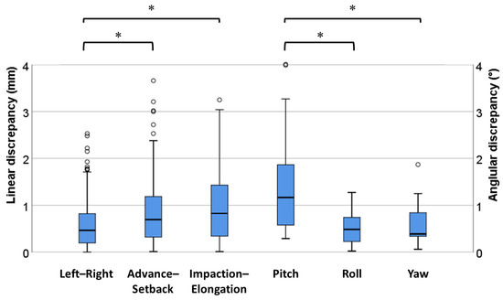 Boxplots of the linear and angular discrepancies between simulation and postoperative computed tomography models (*; p < 0.05).