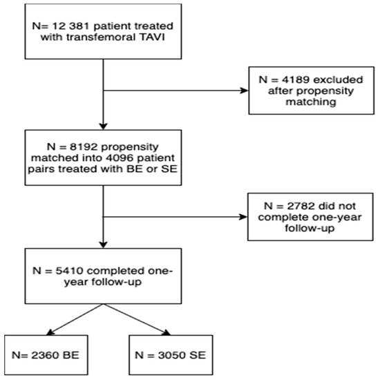 A total of 12,381 patients undergoing TAVI received either a BE- (n = 6239) or SE-valve (n = 6142). Baseline characteristics of the overall and propensity-matched population are presented in Supplementary Table S2. After propensity matching, a total of 8192 patients with either BE- (n = 4096) or SE-valves (n = 4096) were included. In this matched population, one-year follow-up was completed in 5410 patients. One-year follow-up was completed in 74% of SE-valve patients and 58% of BE-valve patients. Baseline and procedural characteristics of patients with vs. without one-year follow-up completed are presented in Supplementary Table S3. Patient flow is presented in Figure 1.