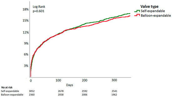 Time-to-event Kaplan–Meier all-cause mortality curve of balloon-expandable vs. self-expandable valves in patients undergoing transcatheter aortic valve implantation.