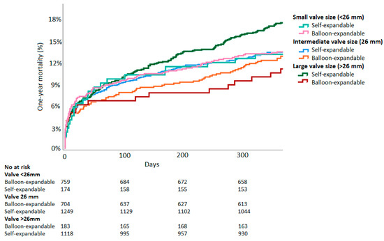 For hypothesis-generating purposes, valve sizes were divided into three groups: Small (<26 mm, BE: n = 759, SE: n = 174), medium (26 mm, BE: n = 704, SE: n = 1249), and large (>26 mm, BE: n = 183, SE: n = 1118). In the large valve size group, patients receiving BE-valves showed lower mortality than those receiving SE-valves. (BE: 11.1% vs. SE: 17.6%, RR 1.59, 95%CI 1.03–2.44, p = 0.03). However, mortality was similar in the medium size group (BE: 13.0% vs. SE: 13.4%, RR 1.03, 95%CI 0.81–1.31, p = 0.80) and in the small valve size group (BE: 13.5% vs. SE: 13.1%, RR 0.97, 95%CI 0.64–1.49, p = 0.90). Kaplan–Meier curves split by valve size groups are displayed in Figure 3.