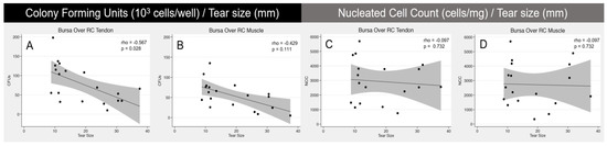 Scatterplot representations of Spearman’s rank correlation coefficient analysis. The left scatterplot demonstrates a significant (p < 0.028) negative correlation between tear size and number of CFUs from the cells of the SB over the RC tendon (A). The right three scatterplots show no significant correlation between tear size and CFU from SAB over RC muscle (B) or NCC of the cells from SB over RC tendon (C) and muscle (D). Grey shading around regression line represents 95% confidence interval.
