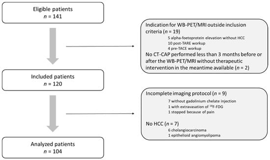 All patients aged 18 years or older referred to our institution for HCC and who underwent WB-PET/MRI between 26 June 2017 and 18 December 2019 were eligible for this retrospective institutional review board (IRB)-approved study (IRB number, CRM-1910-032). Written informed consent was waived by IRB. A total of 141 patients were retrospectively screened for inclusion. Inclusion criteria were as follows: (i) HCC patients with BCLC stage A, B or C, (ii) WB-PET/MRI baseline evaluation before curative therapies (including orthotopic liver transplantation, surgical resection, and local ablation) or before TARE, and (iii) CT-CAP performed less than three months before or after the WB-PET/MRI and without any therapy performed in the meantime. A total of 120 patients were subsequently included. Eighteen of these were excluded from analysis because of incomplete WB-PET/MRI protocol (n = 9) or because pathological diagnosis revealed cholangiocarcinoma (n = 6) or epithelioid angiomyolipoma (n = 1). As a result, the final study population consisted of 104 patients (Figure 1).