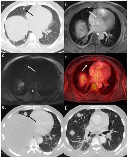 A 56-year-old patient referred to WB-PET/MRI before TARE. The CT-CAP (a) showed a solitary rounded 7 mm-size lung nodule (arrows). The WB-PET/MRI confirmed an infracentimetric lung nodule visible on morphologic sequences (T1-weighted after gadolinium injection) (b) with hyperintensity on b800 s/mm2 DWI (c) and 18F-FDG hypermetabolism (d) leading to the diagnosis of lung metastasis. The followup CT scan (e,f) performed three months after the WB-PET/MRI showed a significant progression of the number and size of lung nodules, confirming the metastatic status.