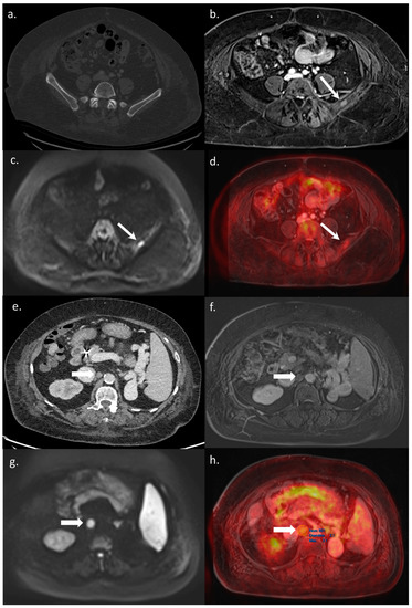 A 65-year-old BCLC C patient referred for a WB-PET/MRI before liver transplantation. On CT-CAP, no bone lesion was visible (a). The WB-PET/MRI revealed an infracentimetric bone lesion with enhancement after Gadolinium–chelate injection (b), together with hyperintensity on DWI (c), and focal hypermetabolism on 18F-FDG-PET (d) leading to the diagnosis of bone metastasis. Moreover, on CT-CAP, a retroperitoneal nonspecific lymph node was observed (e), visible on morphologic MRI sequence (f). Both diffusion restriction (g) and 18F-FDG hypermetabolism (h) were observed leading to the diagnosis of lymph node involvement. The patient was excluded from the liver transplantation list, with a rapidly progressing disease leading to patient death within three months.