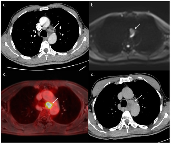 A 68-year-old BCLC C patient referred to WB-PET/MRI before TARE. The CT-CAP performed (a) showed a 12 × 25 mm large mediastinal lymph node of indeterminate nature. The WB-PET/MRI revealed hyperintensity on b800 s/mm2 DWI (b) with hypermetabolism on 18F-FDG-PET (c) suggestive of metastatic involvement. Followup performed two months later confirmed the metastatic nature of the lymph nodes with rapid increase in size and necrosis (d).