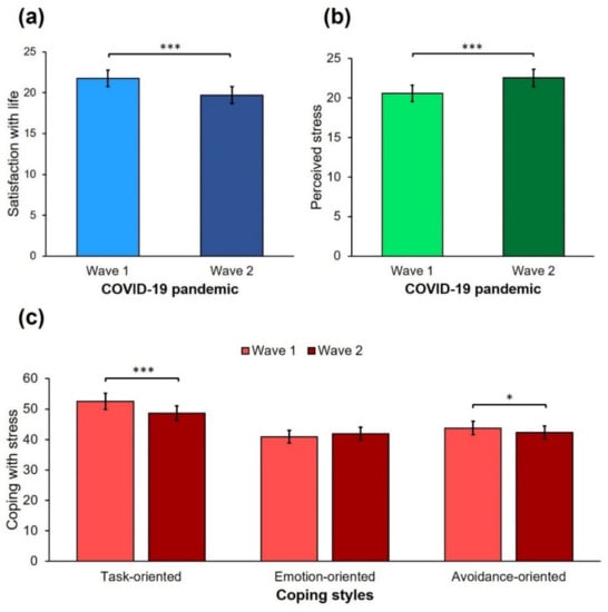 Differences between the first and second waves of the COVID-19 pandemic in (a) satisfaction with life; (b) perceived stress; and (c) task-oriented, emotion-oriented, and avoidance-oriented coping styles. * p < 0.05, *** p < 0.001.