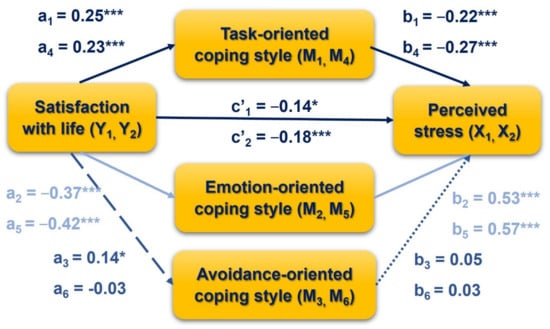 Path model of mediation for the effect of perceived stress on satisfaction with life, via coping styles; cross-sectional design (Model 3 and Model 4). * p < 0.05, *** p < 0.001.