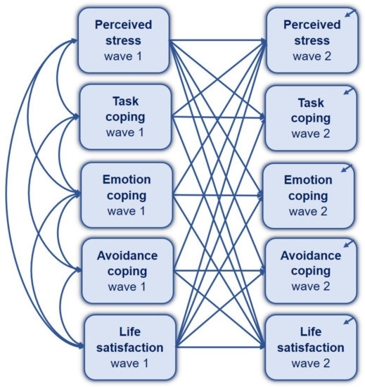 Next, a two-wave cross-lagged panel design with a time lag of a half-year between W1 and W2 was performed for testing the prospective effect of perceived stress and coping styles on life satisfaction [84]. Two waves of data collection are recommended as the optimal approach to longitudinal design because it curtails the cost of a study in terms of time and money [85]. Structural equation modeling (SEM) was used, based on maximum likelihood (ML) estimation, without missing values, including observed variables, and with the bootstrapping method to test the conditional effect. The parallel mediation model specified included ten observed variables. We decided not to use latent variables because of the problems related to measurement invariance for the total 126 items included in 10 variables (W1 and W2). Both cross-lag and autoregressive paths were used to examine stability and change simultaneously [86,87]. All latent structural models were evaluated using several goodness-of-fit criteria, including ML χ2, df, and p-value (the ratio χ2/df < 5 representing a good fit), standardized root mean square residual (SRMR ≤ 0.08 indicates an acceptable fit), root mean square error of approximation (adequate fit if RMSEA ≤ 0.08), comparative fit index (CFI ≥ 0.90 meaning adequate fit), normed fit index (NFI ≥ 0.95 considering adequate fit), and the Tucker–Lewis index (TLI ≥ 0.90 indicating adequate fit) [88,89,90]. All statistical analyzes were conducted using SPSS 27 (for descriptive statistics, ANOVA, and correlation analysis) and AMOS 22 (for SEM).