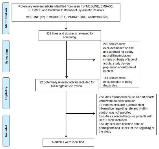 Using our search strategy, a total of 429 potentially eligible articles were identified through Rayyan [15]. One hundred and eighty-three articles were excluded due to duplicated studies. After the exclusion of 226 articles because they clearly did not meet the inclusion criteria, based on article types, methodologies, and outcomes of interest, 22 articles remained for the full-length review. Two were excluded as all participants had undergone catheter ablation. Twelve were excluded because no clear data regarding rate and rhythm control were specified. Two were excluded due to the inclusion of HFrEF patients in the analysis. Lastly, one study was excluded because all participants did not have HFpEF at the beginning of the study. In conclusion, the final analysis included five observational studies (four retrospective cohort studies and one prospective cohort study). The literature retrieval, review, and selection processes are demonstrated in Figure 1. The characteristics and quality assessment of the included studies are presented in Table 1.