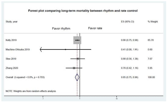 With regard to long-term mortality, rhythm control was associated with a lower mortality rate (pooled RR 0.85, 95% CI 0.75–0.95, p = 0.009). There was only trivial heterogeneity in this analysis (I2 = 0%) (Figure 2).