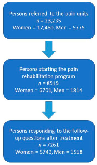 All patients included in this study were between 15–88 years old, with chronic pain treated at one of the 40 pain clinics that report to the Swedish Quality Registry for Pain Rehabilitation. For the period 2016–2019, the register contains 23,235 patients who were referred to a pain clinic, 8515 patients who were admitted to IPRP, and 7261 patients who completed the IPRP and answered the questionnaires after the IPRP. The study group at baseline for the present study consists of the patients who were admitted to IPRP, and the study group who completed IPRP consists of those who underwent IPRP and filled out the questionnaires in connection with end of IPRP. The selection process is summarized in Figure 1.
