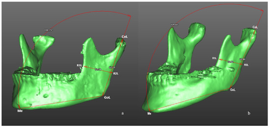 Morphometric analysis of the mandible after three-dimensional volumetric reconstruction of CBCT scans in a patient of L-GA group (a) and in a patient of H-GA group (b). Linear measurements included mandibular ramus high (Co-Go) and mandibular ramus width (R1-R2). Angular measurement included gonial angle (Condilion-Gonion-Menton; Co-Go-Me).