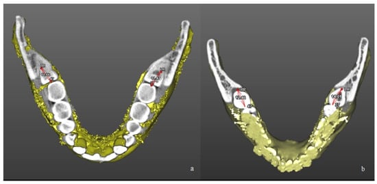 Linear measurement of the retromolar space after three-dimensional reconstruction of CBCT scans in a patient of L-GA group (a) and in a patient of H-GA group (b). The retromolar space was calculated as the distance between the distal surface of the second molar and the anterior border of mandibular ramus (3.7—Left Ramus; 3.7-LR; 4.7—Right Ramus; 4.7—RR).