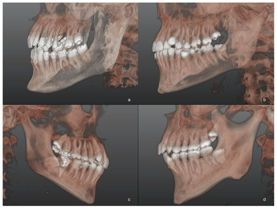 Three-dimensional images of M3M after 3D reconstructions of CBCT scans in patients of L-GA group. Different levels of M3M position in relation to the adjacent alveolar crest were reported: the most superficial M3M, completely erupted (a); partially impacted M3M in horizontal position (b); completely impacted M3M in the ramus with distoangular position (c); the deepest impacted M3M with roots closer to mandibular canal (d).