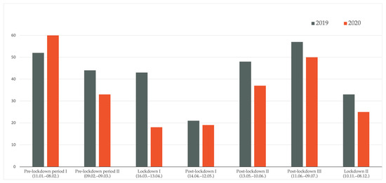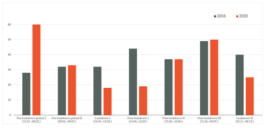 p = 0.022); i.e., differences were detected between 2018 and 2020 for the first pre-lockdown period I (11 January–8 February), lockdown period I (16 March–13 April), and post-lockdown period I (14 April–12 May). Between 2019 and 2020, a significant difference was found only regarding lockdown period I (16 March–13 April). As depicted in