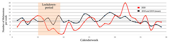 Figure 2, during lockdown period I (16 March–13 April), 32 and 43 melanomas were diagnosed in 2018 and 2019, respectively, compared to only 18 melanomas in 2020.