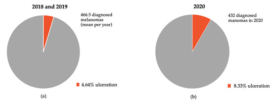 p = 0.012 for 2019 vs. 2020). During lockdown period I in 2020 11.1% of diagnosed melanomas were ulcerated, compared to 10.5% in post-lockdown period I and 13.5% in post-lockdown period II. The percentages of ulcerated melanomas in 2018/2019 and 2020 are depicted in