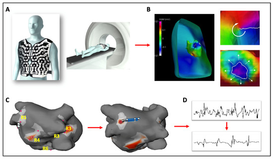 Electrocardiographic imaging mapping or ECGi mapping is a non-invasive phase mapping approach that utilizes a 252 body-surface electrode array combined with thoracic imaging to display virtual cardiac potentials on the epicardial surface (Figure 1). Re-entrant and focal activities are identified from activation maps generated from unipolar electrograms combined with phase mapping analysis. This technique was first applied by Cuculich et al. in 2010 in a study of continuous bi-atrial activation mapping in human AF validated against invasively generated CARTO maps [61]. In this study, multiple wavelets were identified as the most common pattern of activation in 92% and ablation at critical sites on ECGi resulted in restoration of sinus rhythm. Subsequently, using the commercially available ECVUE mapping system (CardioInsight, Cleveland, OH, USA), the Bordeaux group described unstable re-entry circuits with varying spatio-temporal activity (in contrast to the stable focal sources demonstrated on FIRM mapping) as the predominant sustaining mechanism in 103 persistent AF patients [62,63]. In patients with ablation-induced AF termination, arrhythmia-free survival was 87% at one year, similar to a comparison group undergoing the stepwise approach. In 2017, the multicentre AFACART study reported on the efficacy of ECGi guided ablation in persistent AF patients, in eight European centres, using AF termination as a primary endpoint [64] (Figure 1). Ablation strategy consisted of targeted ablation of drivers and PVI, with further linear ablation if AF persisted. In total 4.9 ± 1.0 driver sites were mapped per patient with 53% located in the left atrium and 27% in the right atrium. Driver-only ablation resulted in AF termination in 64% of patients with 77% free from AF at one year. It is worth noting however that no randomized trial exists to date evaluating this technology in AF ablation.