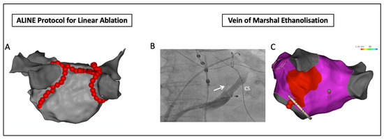 Strategies for substrate ablation in persistent AF. (A) Roof and mitral isthmus lines created using optimized RF lesions as per the ALINE protocol. (B) Fluoroscopic image of contrast injection of the coronary sinus with the Vein of Marshall indicated by the white arrow. (C) Voltage map post ethanolization of the Vein of Marshall demonstrating the resultant area of low voltage and additional endocardial lesions at the mitral annulus performed to achieve mitral isthmus block. CS = coronary sinus.