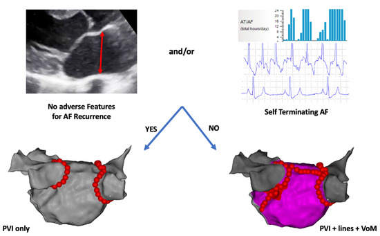 Proposed ablation strategy for persistent AF. Patients with no adverse features for recurrent AF (left atrial dilatation, fibrosis, etc.) and/or evidence of self-terminating AF on continuous monitoring undergo PVI only while those with adverse features or non-self-terminating AF undergo PVI plus linear ablation at the roof and mitral isthmus facilitated by Vein of Marshall ethanolization. VoM = Vein of Marshall (ethanolization).