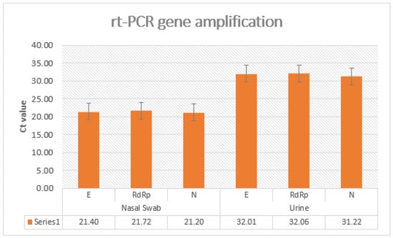 The Ct value at 3 genes analysis with a range value for the cycle threshold of patients with positive SARS-CoV-2 PCR in a nasal swab and urine.