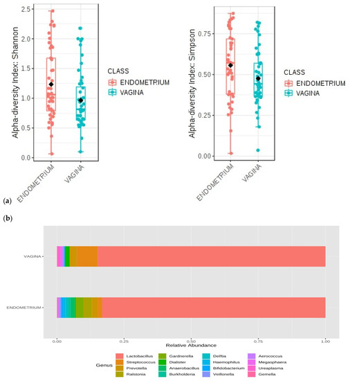 Gardnerella spp. in the cervix more frequently than fertile women. In relation to the above-mentioned study, our analysis of alpha and beta indices for the microbial diversity of vaginal and endometrial samples revealed significant differences. Although the diversity of the vaginal microbiome could be expected a priori to be higher than that of the endometrial one due to factors such as more direct exposure to the outside of the body and direct contact with the seminal sample during sexual intercourse, the present study found a more diverse microbiome in the endometrium than in the vagina. This fact could be due to the non-dominance of a genus (more than 90% of relative abundance according to current scientific evidence), which can lead to colonization by other types of microorganisms and, thus, generate a more diverse environment, which might be related to infertility.