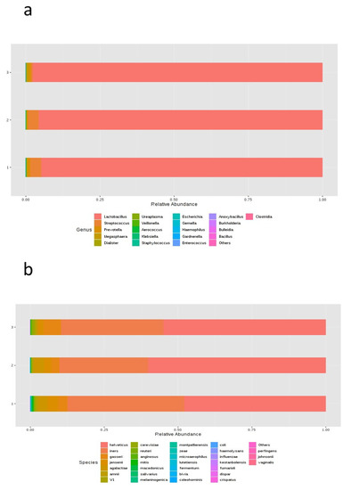 In the present study, the taxonomic characterization showed differences in the microbial profiles between the vaginal and endometrial samples in terms of genera and species. The univariate analysis performed on the relative abundance of the different genera by sample type reached statistical significance for