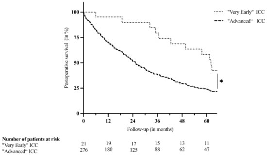 Postoperative survival after resection of “very early” (single tumor ≤ 3 cm) and “advanced” (>3 cm, multifocality or extrahepatic disease) intrahepatic cholangiocarcinoma (ICC). * p-value: 0.013.