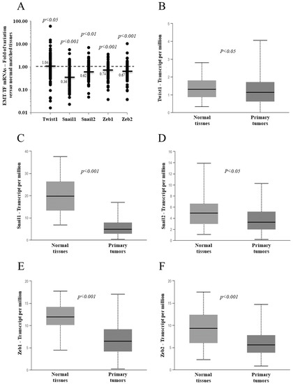 Analyses of the five EMT-TFs mRNA levels of the 95 PTC tissues, compared to their normal matched tissues, revealed that all of them were deregulated in the majority of cancer tissues, as shown in panel A of Figure 1. With the exception of Twist1, which showed a minimal, but significant, increment in the median value, all the other EMT-TFs showed a significant reduction in their medians compared to the normal matched tissues (Figure 1). A very similar outcome emerged from the analysis of a case study from The Cancer Genome Atlas (TGCA) network comprising 505 PTCs, as reported in panels B–F of Figure 1 [26,29]. It has to be mentioned that, while, in our analyses, the mRNA levels of the different EMT-TFs in PTC tissues were compared with the normal matched tissues, in the TGCA study, the EMT-TF expressions found in 505 PTC tissues were compared with those found in 59 unmatched normal tissues [26].