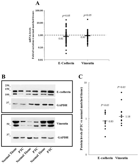 Regarding the two EMT markers, we found that the expression of E-cadherin strongly decreased in ATC, while that of vimentin was not significantly modulated (Figure 5).