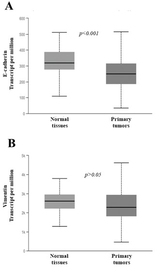The analysis of the mRNA data from the TGCA case study (Figure 3) indicated a significant reduction of the E-cadherin expression in PTC tissues, while that of vimentin was not significantly affected.