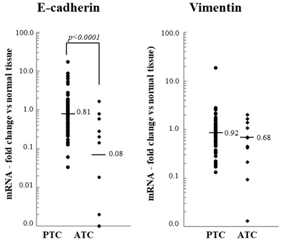 The E-cadherin and vimentin mRNA levels of 95 papillary thyroid cancer (PTC) and 12 anaplastic thyroid cancer (ATC) tissues. The small bars represent the median with the values indicated. The dotted line represents the expression levels in normal tissues.
