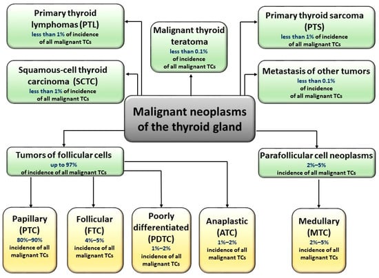 According to the World Health Organization classification, malignant thyroid cancers can be divided into five main histological types [4]: papillary (PTC), follicular (FTC), poorly differentiated (PDTC), medullary (MTC), and anaplastic (ATC). Each of these types, except for MTC (derived from parafollicular, C cells), is derived from follicular cells. Research undoubtedly shows the complexity of thyroid tumors, as some of these tumors may be of mixed (follicular-parafollicular) origin [5]. In addition, many malignant neoplasms of the thyroid gland are lymphomas (most often B-cell) and sarcomas. Figure 1 shows division of malignant TCs and the descriptions of particular types of TCs are shown in Supplementary Materials (Table S1).