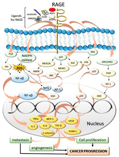 AGE-RAGE interaction evokes constant and strong cellular response, inducing an intracellular cascade of inflammatory reactions which lead to release of proinflammatory cytokines [85], intensification of oxidative stress, increased risk of coagulopathies [86], overexpression of different extracellular matrix proteins (such as collagen or laminin) [87], and activation of secondary signal transmitters, e.g., kinase C. These processes promote alterations in cellular stimulation, migration, and proliferation, leading to pathological condition such as diabetic complications, sclerosis, Alzheimer’s disease, inflammation, and tumor development [88]. Most of these conditions are due to RAGE-associated release of intermediates of various cell signaling pathways, such as ROS, p21ras, erk1/2 (p44/p42), MAPK kinase [89] p38, SAPK/JNK MAP kinases, rhoGTPases, phosphoinositol-3 kinase, and intermediates of JAK/STAT pathway.