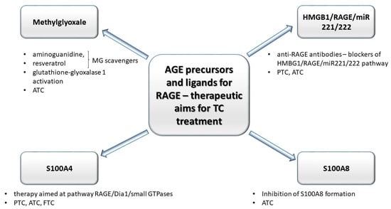 RAGE, its ligands, and compounds engaged in glycation may be investigated as potential aims of TC treatment, as some of them have been shown to affect thyroid cancer aggressiveness. The increase in methylglyoxal concentration, often observed in ATC, may be lowered by treatment with aminoguanidine and resveratrol. Anti–RAGE antibodies, however, were shown to effectively decrease the concentration of miR221 and miR222 (increased in thyroid cancer). Moreover, the inhibition of S100A8 proglycative function of S100A8 was proposed to be an appropriate therapeutic target in patients with anaplastic thyroid cancer.